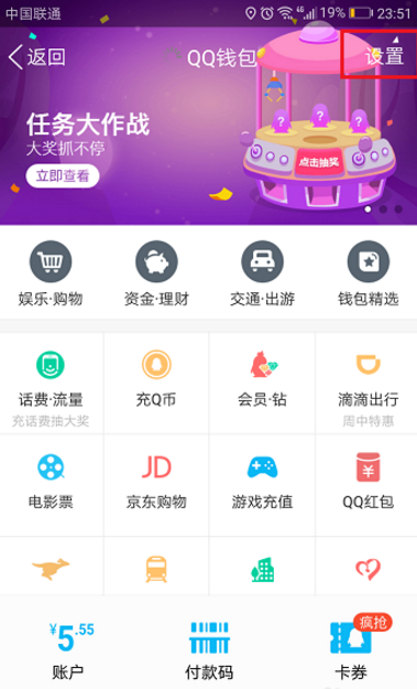 2、进去QQ钱包界面,选择最上方的设置,如下图所示,
