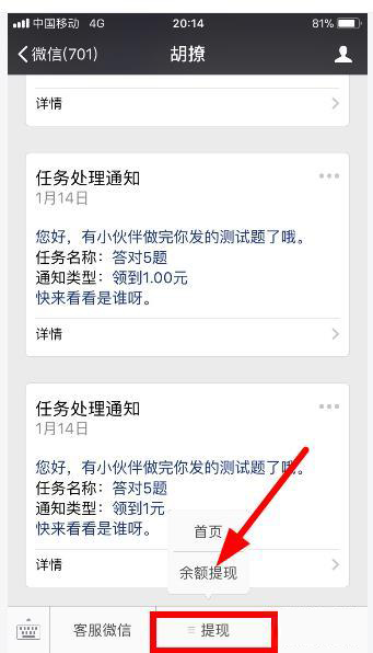 1、首先,微信搜索胡撩公众号并关注!然后,在主页里找到提现的位置,并点击余额提现的按钮!