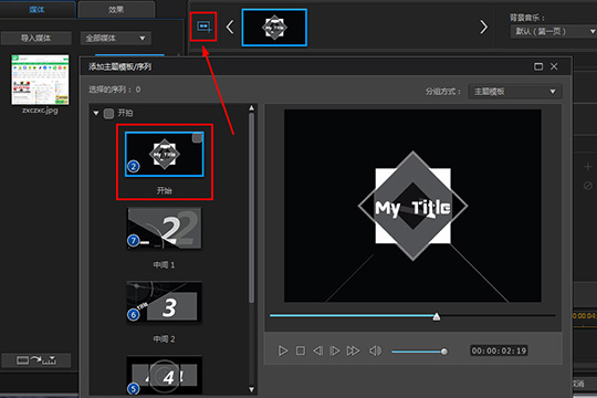 3、弹出主题设计器的界面,在刚进入到此界面时将会出现添加注意模板/序列;的窗口,如果你不小心关闭了此界面,只需点击上方红框标注内的添加更多序列;进行主题模板的添加,用户可以根据自己的需要合适的封面,小编默认选择开始;后勾选此序列右上角的框,最后点击确定;,如下图所示: