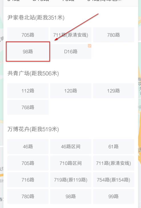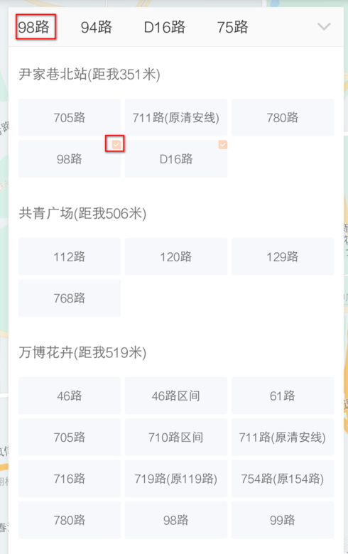 4.点击“98路”,那么这个公交就被你选择了,右上角会出现一个“√”