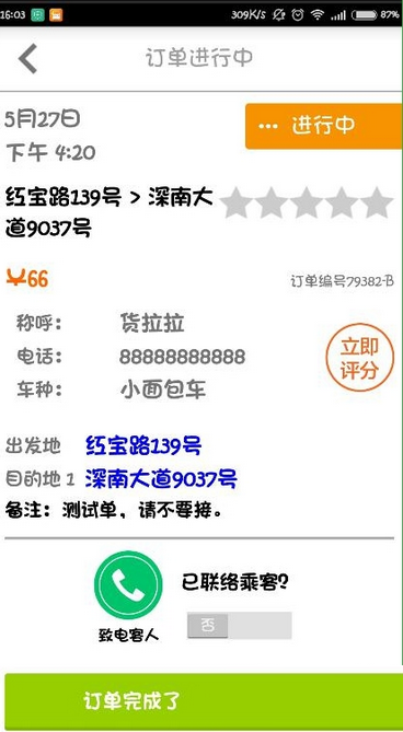 3、接单成功,现在打电话给客户吧,协商好以后再去客户那里,把货送到目的地后就可以点完成订单了,一定要记得点完成噢