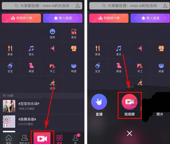 1)打开美拍软件之后,点击正中间的【摄影】图案,接着选择【短视频】并点击;(如下图)