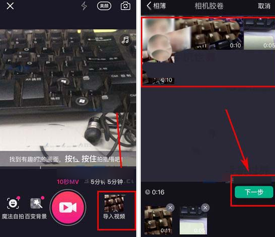 2)再点击右下角的【导入视频】,先在相机胶卷里点击你任意想导入的短视频,之后点击【下一步】;(如下图)