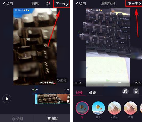 3)然后这时你可以对视频进行剪辑,剪辑完之后点击右上角的【下一步】,接着你还可以美化下视频,弄好之后点击右上方的【下一步】;