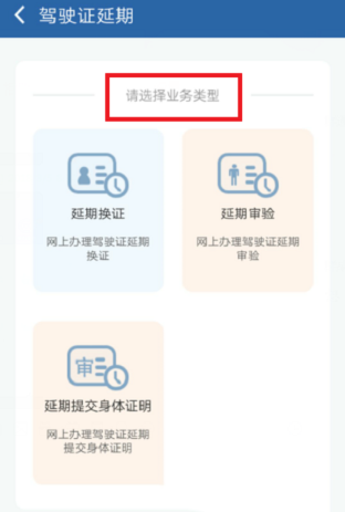 选定符合各自的延期类型,若是延期换证,则轻按首框进入,延审点后面的框。
