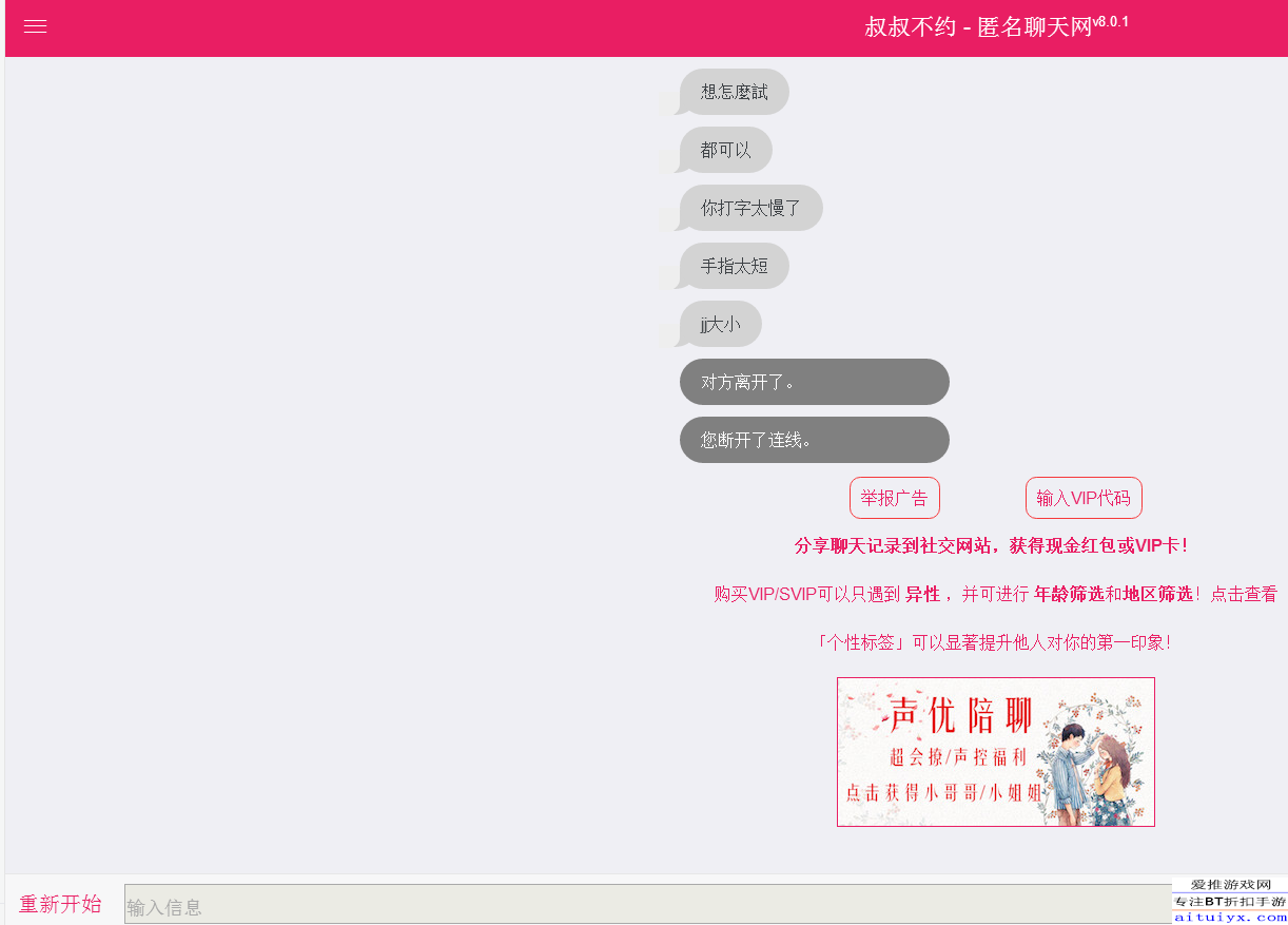 上述就是小编为大家带来的叔叔不约匿名聊天总是匹配到男的怎么办问题回答吧,希望能帮助到大家,更多相关问题一定要持续关注我们!