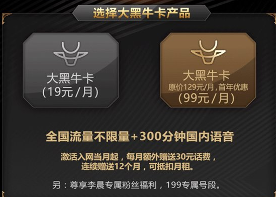 “大黑牛卡”配置了199专属号段,如李晨生日1124号段、年份2018、2019号段等。