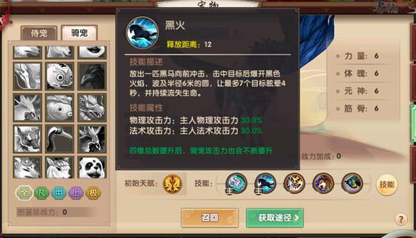 由于该骑宠是极品骑宠,所以最初固定的四维全部都是6点,而基础最高可以达到10点。在其进化成仙兽之后,则可以通过喂养来进行提升,最高四维可以达到12点。