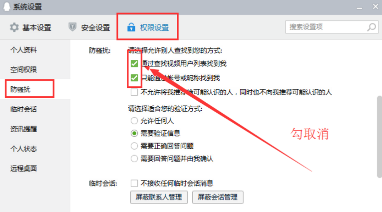3、进到权限设置面板,选择防骚扰中的请允许别人查找您的方式,将勾去掉,