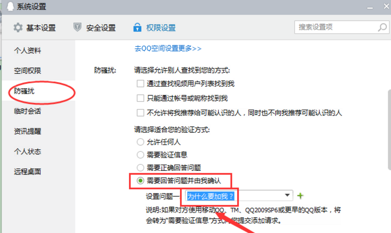 4、设置别人加好友时的验证方式为需要回答问题并由我确认,如下图所示,