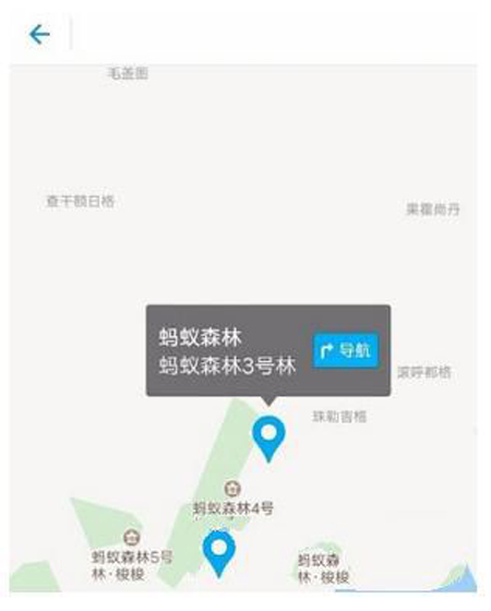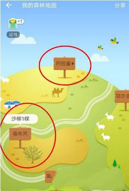 可以看到自己的蚂蚁森林状况,我已经种植了一棵沙柳,点击这个地图进入,如下图所示。