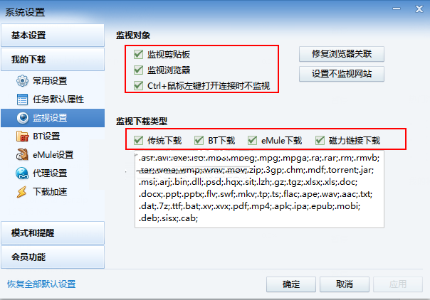 2、选择我的下载→监视设置,勾选监视对象与监视下载类型中的所有选项。