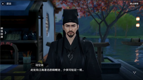 这是作为奇遇引导任务而出现的。如果玩过端游相信对本任务npc司空央相当眼熟,自从给帝王州盟主叶知秋算了个天煞孤星的命格后就消失在端游剧情中的他在手游剧情里再度登场。此时的他神神叨叨的出现在主角面前,一句“少侠慢行,此处锦鲤池可驻足一观”画面淡入,带领你进入了剧情位面。