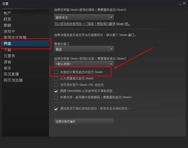 在里面的【界面】设置中,将【在我的计算机启动时运行steam】这个钩即可。