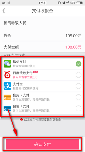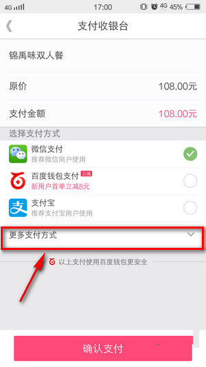 接下来就是付款界面了,点击“更多付款方式”你会发现还有很多付款方式可以选择,不用担心你微信或支付宝余额不足了