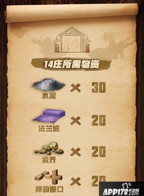 升级到14庄所需物资如图所示,值得注意的是需要20个家具工专属物资:榫卯接口,熟练度级别要求为70。