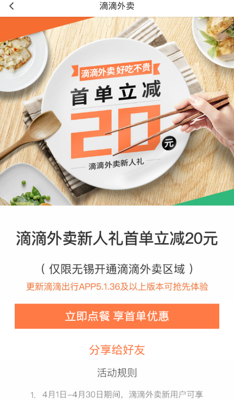 不过其他地区的朋友也不用太过羡慕,相信在很快之后,滴滴外卖就会推广到你的城市了,而且现在还有着不少福利活动,大家快来下单购买吧!