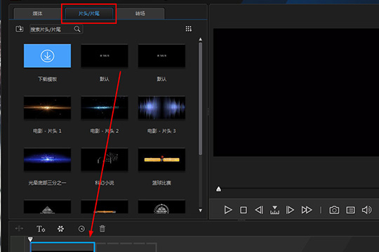 2、成功进入到编辑界面,点击上方栏目中的片头/片尾;,用户可以在其中找到自己喜欢的片头片尾样式,选择之后将其拖动到下方的时间轴中即可对其进行编辑,如下图所示: