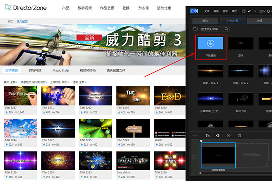 3、当然如果你认为软件自带的片头片尾不符合你的预期,则可以点击红框标注内的下载模板;选项,在点击后将会弹出官网的窗口,用户可以其中寻找自己喜欢的片头片尾,如下图所示: