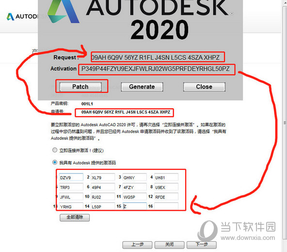 14:使用管理员身份打开注册机(一定要确保电脑是断开网络状态,也就是不能连接网络的模式),将申请号复制到request;方框中,点击patch;,点击Generate;,计算机激活码,将计算出来的激活码复制到下面。点击下一步;。