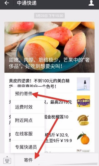 进入公众号,找到左下角寄件选项,点击后弹出一系列的图标,然后点击预约寄件;
