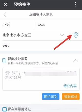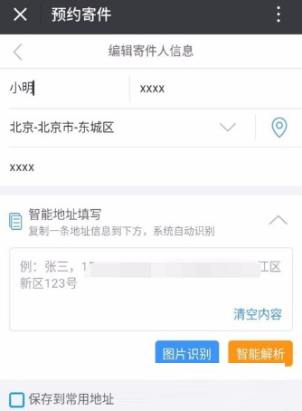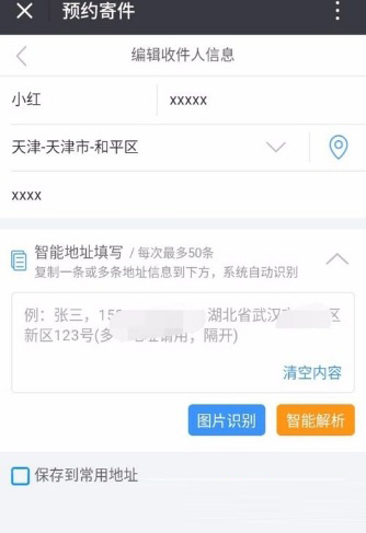 然后就是填写收件人的信息,也是一样,包括姓名、手机号码、收件地址等等,这个时候,下方自动识别功能就比较重要,比如要退货,卖家发送地址,可以直接复制来自动识别;