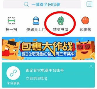 首先打开菜鸟裹裹,在首页点击精灵书屋,如下图所示。