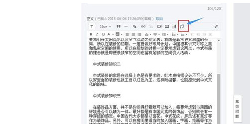 3.在新建图文消息页面,填写标题、选择封面图片,在文本编辑框中输入文字,然后在编辑器中找到音乐图标,如下图所示。