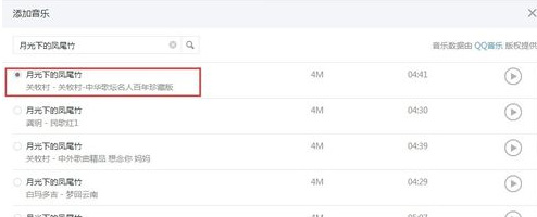4.进入添加音乐的页面,目前还不提供上传本地音乐,只能选择来自QQ音乐的网络音乐。因此需要在搜索框中,输入歌名或者作者来找寻。选择好音乐后点击”确定“即可,如下图所示。