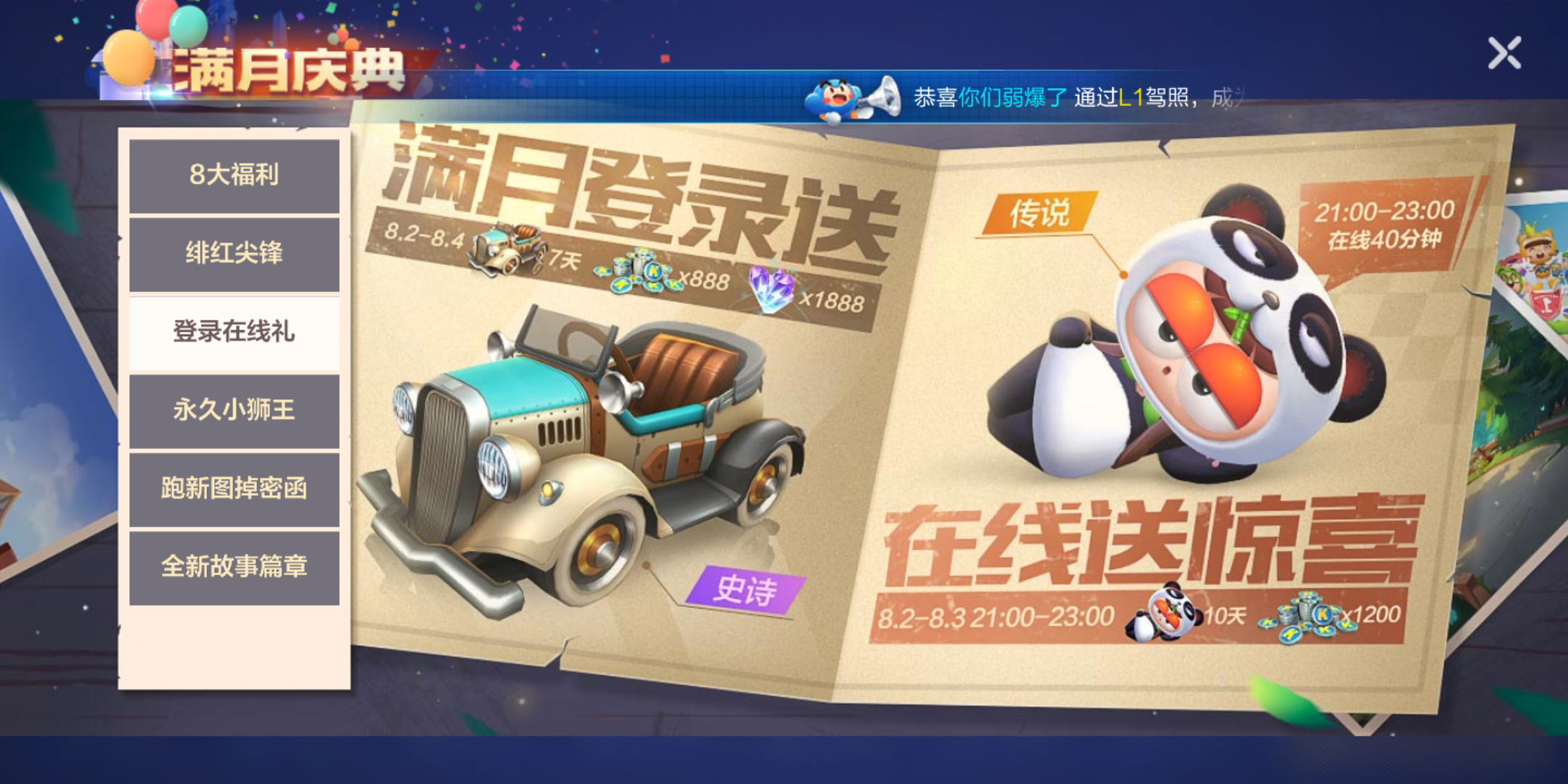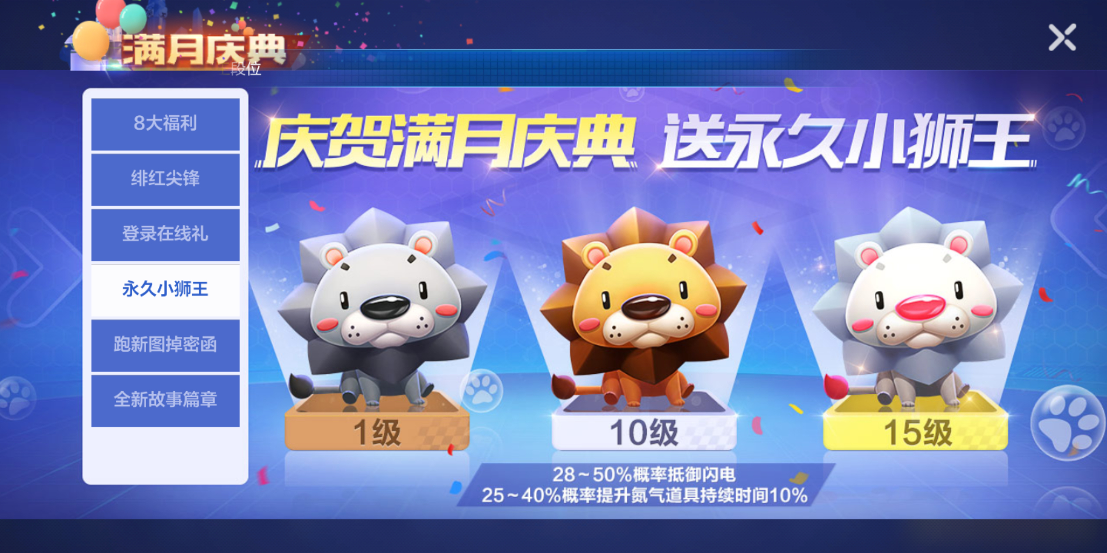 另外跑跑卡丁车除了免费得到小狮王这个活动以外,还有超多的活动是值得玩家们去参与的,不管你是氪金大佬还是零氪党都能在此次满月庆中得到不少非常好用的道具,大家多多刷图吧。