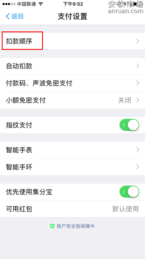 3、随后在支付设置界面下方点击进入【扣款顺序】一栏,如图所示。