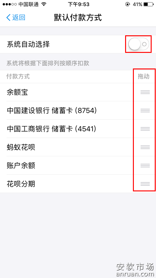 4、最后即可设置默认的付款方式,比如可以开启系统自动选择付款方式,也可以关闭手动设置扣款顺序,可以拖动进行顺序调整哦,如图所示。