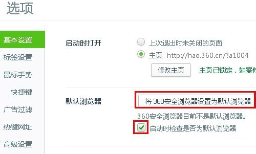 在360浏览器”选项“的基本设置中,在右边默认浏览器设置中,将360安全浏览器设置为默认浏览器,并在”启动时检查是否为默认浏览器“左边打上勾(如下图),这样360浏览器设置为默认浏览器已经设置完成。