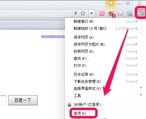 首先,我们打开360浏览器,点击右上角的设置 图标,下拉菜单,选择选项 ,如图。
