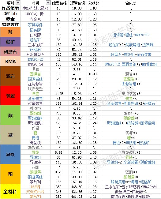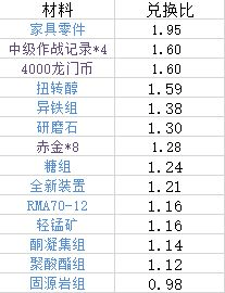 材料价值图,以及材料兑换优先度排序,材料价值不计算活动。
