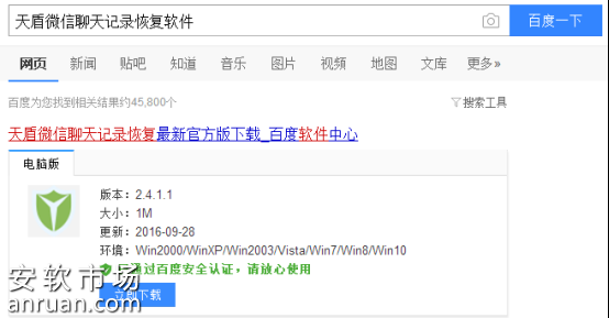 1、首先,下载安装手机数据恢复软件“天盾微信聊天记录恢复软件”到电脑上,在任意浏览器中搜索“天盾微信聊天记录恢复软件”或者进入天盾微信聊天记录恢复软件官网下载即可。