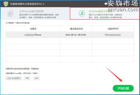2、安装完成之后直接运行天盾微信聊天记录恢复软件,选择“从iTunes备份文件恢复”,待软件检测出iTunes备份的手机数据,请点击“开始扫描”按钮。
