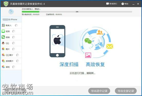 5、操作完上一步后我们会发现软件左侧列出了手机中相关的一系列数据包括(手机联系人、手机通话记录、手机短信以及手机微信聊天记录等等)