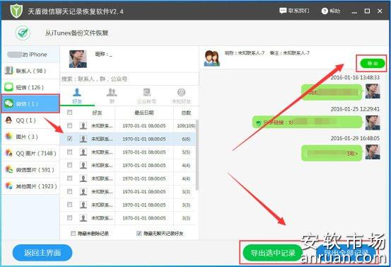 4、找到想要恢复的微信聊天记录,在对应的微信账号左侧方框中打勾,点击导出选中记录,即可将恢复的微信聊天记录备份到电脑本地,方便以后查看了。