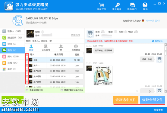 6、点击微信按钮。软件会自动跳转到微信界面。点击恢复选中文件就可以将删除的微信聊天记录恢复回来了。