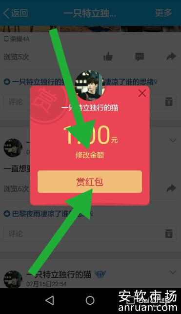 4、点击出来后,有一个随机红包。注意,这个红包的金额是可以修改的。在金额的正下方有一个“修改金额”四个汉字。需要的点击修改,不需要的在下方点击“赏红包”确认支付,打赏成功,如下图
