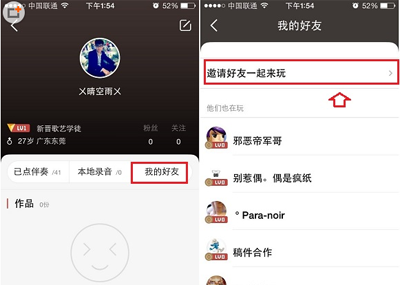 全民K歌后发现,全民K歌目前并没有加好友功能,但可以关注邀请自己的QQ或者微信好友,如下图所示。
