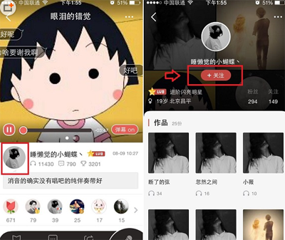 全民K歌关注好友非常简单,在觉得不错的小伙伴歌曲播放界面,点击头像,进入之后,就可以选择“关注”了,如下图所示。