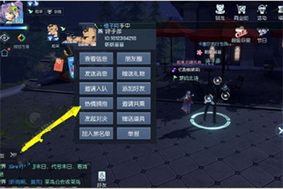 1、首先找到需要拥抱的玩家,之后选中他的角色,之后再次点击他的头像,这个时候会出现许多的选项,点击【热情拥抱】;