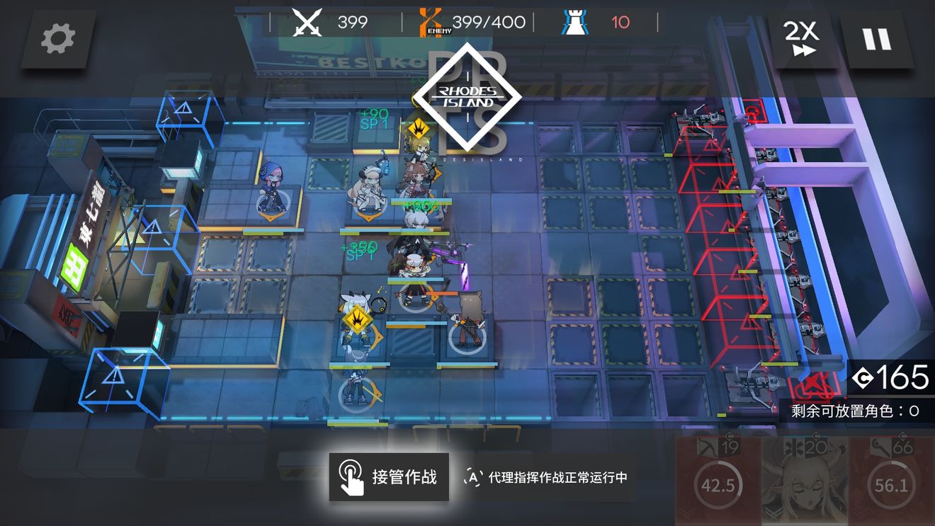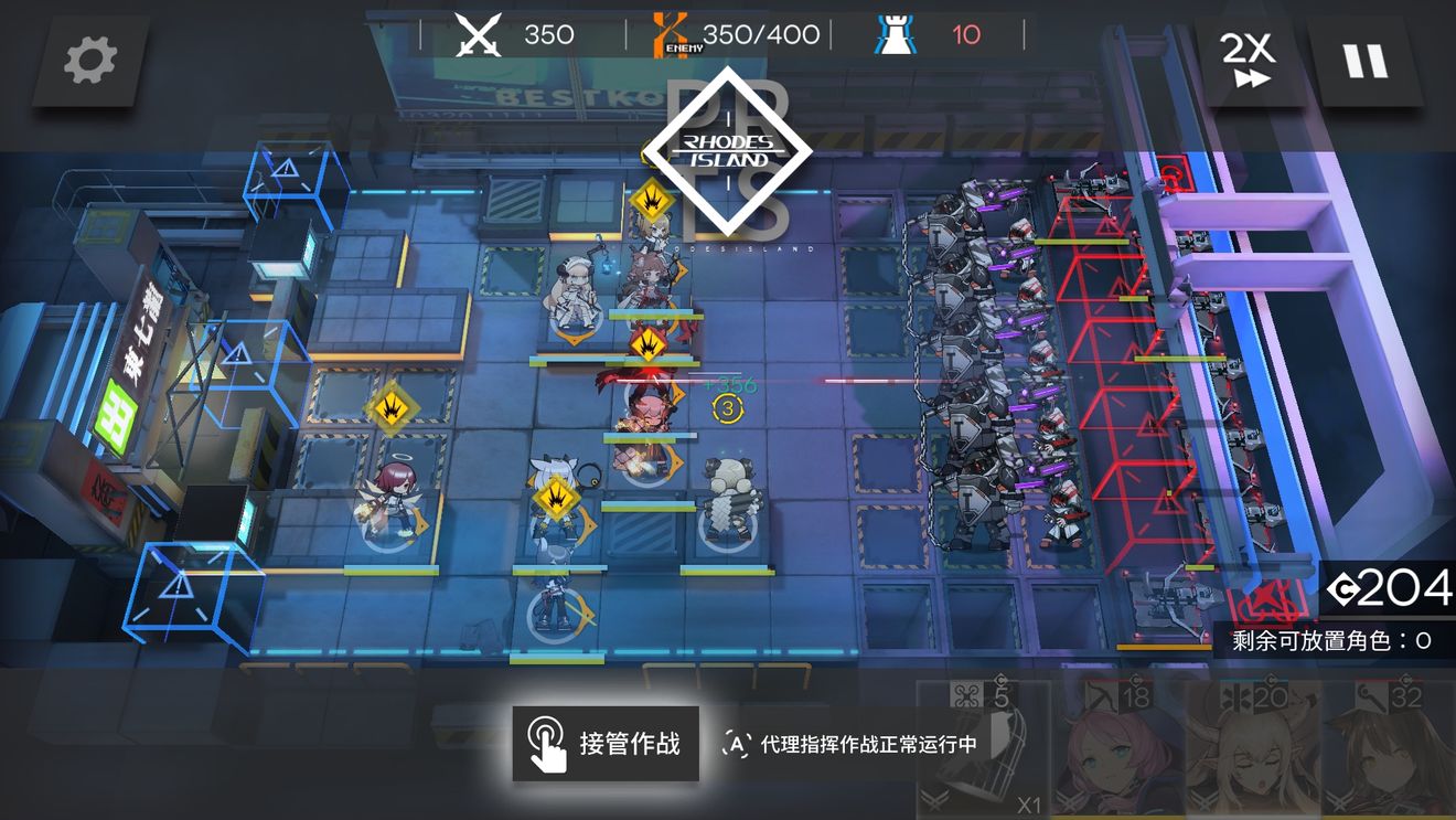 开局如图,干员先后顺序为,德狗,银灰,白面,小绵羊,小火龙,塞雷亚,推王,夜莺,蓝毒。可以用任意单体狙替代但输出要够,主要用来清下路法师不打的飞机和分担下路德狗的压力。开局放完就能站撸到大约350左右,中间有一波飞机只要放一个鸟笼就能吸引所有。