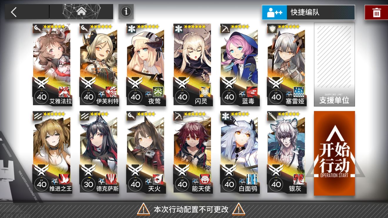 小绵羊的位置可以用天火替代,银灰可以换星熊或者任意能抗的盾。但是换了盾的话清飞机会麻烦一点,后排狙击要根据漏的飞机换位置。推王可以用任意档二以上的近卫替代,小火龙一定要有,输出主要靠小火龙和另一个法师,奶开技能的时机要把握好,塞雷亚的位置开技能是可以奶到所有前排的,可以快速补充夜莺和白面鸮的空窗期提高容错率。