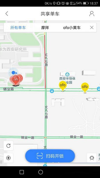如下图显示,在新版的百度地图中,可以看到ofo小黄车、摩拜共享单车的图标选项,选择之后便可进行扫码解锁操作,无需单独安装相应的App了。