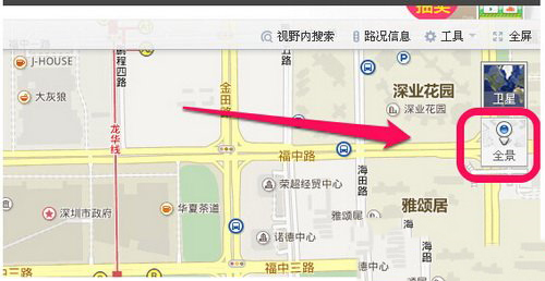 2、进入地图页面后,进入我们的城市,然后在右上角的卫星地图切换图标下面都了一个全景的图标