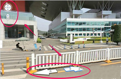 5、进入街景地图后,我们看到一个街景地图,地图上标有方向,左上角是方位和放大缩小按钮