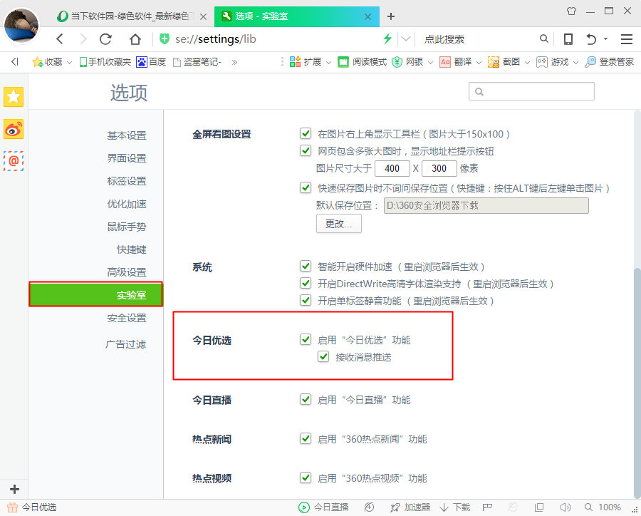 3、进入到“选项”菜单中,在右边菜单栏选中“实验室”,然后找到“今日优选”,去掉其中的所有勾选;